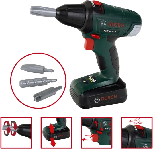 Glavna zvijezda je bežična aku bušilica/odvijač sa zvukom, svjetlosnim efektom i rotirajućim vijkom, koja odlično simulira rad pravog alata. Ne nedostaju ni 4 zamjenjiva nastavka, pilica s udobnim držačem, čekić, francuski ključ, 2 plastične pločice s rupama, 4 vijka i 2 čavla – sve od izdržljive plastike.