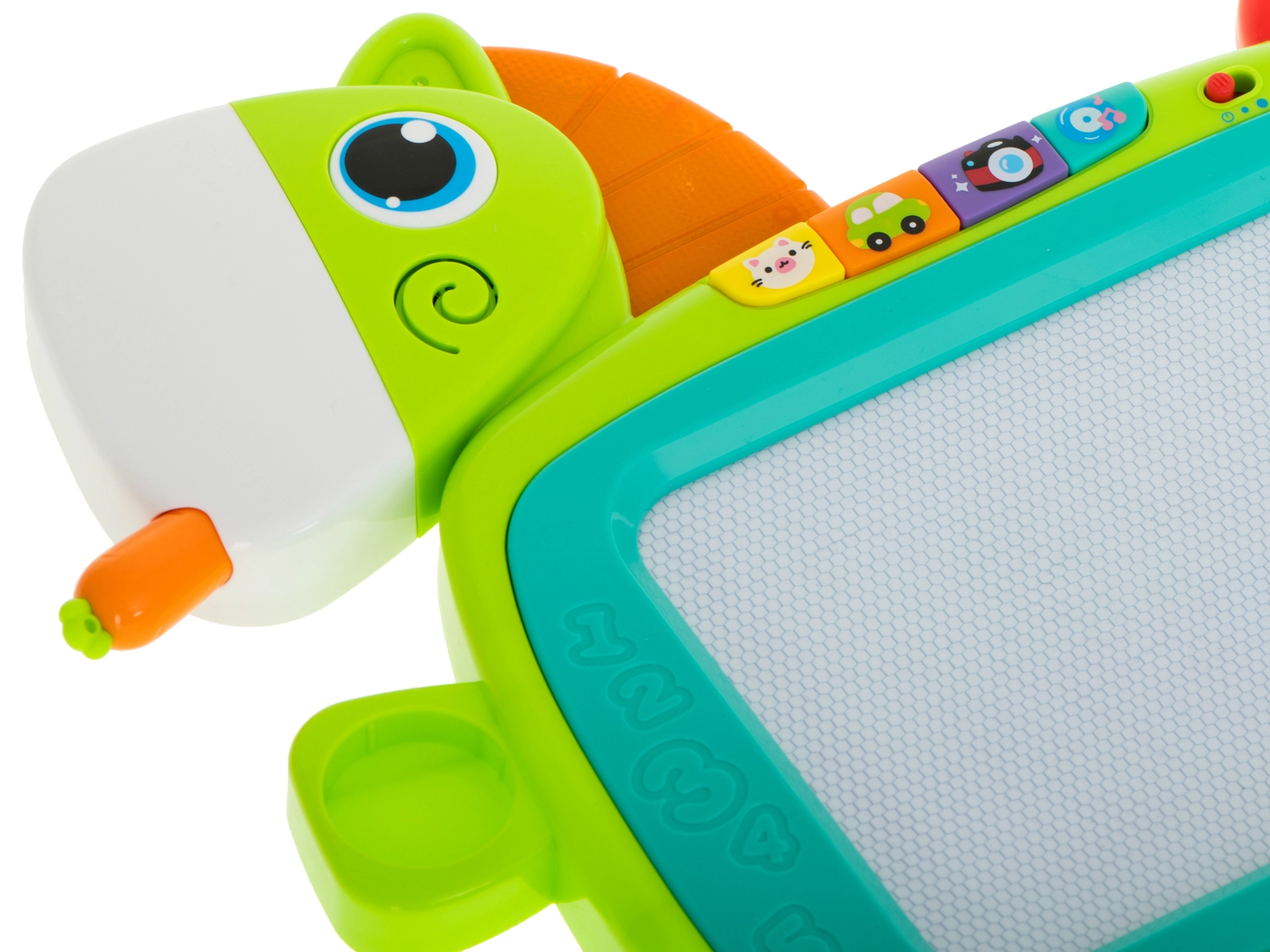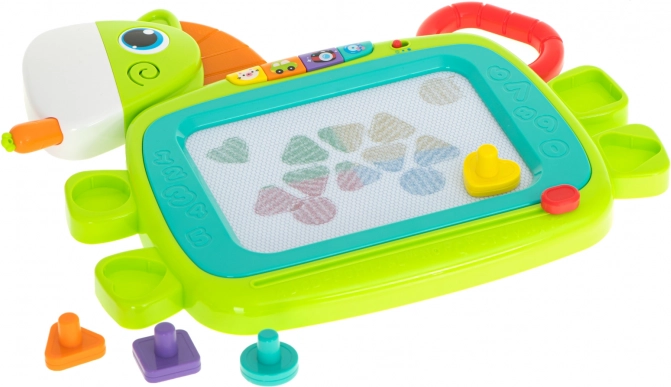 Interaktivni elementi donose zvukove životinja, zvukove prijevoznih sredstava, zvukove iz kućanstva i vesele melodije. Igračka ima 2 razine glasnoće i mogućnost potpunog isključivanja zvuka. Olovka u obliku mrkve pri umetanjу u „usta” konjića proizvodi efekt krckanja. Rubove ploče krase izbočena slova i brojke – idealno za prvo upoznavanje s oblicima.