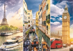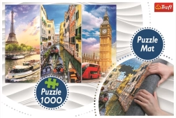 Minden, amire a kirakózáshoz szüksége van, egy dobozban található. A készlet az esztétikailag figyelemfelkeltő Párizs–Velence–London városkollázst ötvözi egy funkcionális, feltekerhető alátéttel, amely helyet takarít meg és védi a félkész és a kész puzzle-t is. Az alátéten áttekinthetően fel vannak tüntetve a TREFL 500, 500 panorama, 1000 és 1500 darabos puzzle-k méretkontúrjai, így mindig pontosan tudja, hová helyezze a képet.