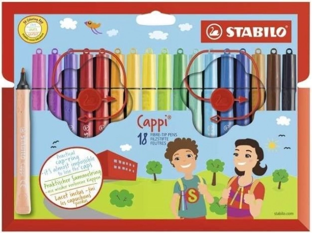 A STABILO Cappi filctollak 18 darabos készlete 6 éves kortól ideális iskolásoknak. Rendelkezik kupakgyűrűvel az elvesztés és a kiszáradás megelőzésére, kimosható tintával, ergonomikus markolattal, kb. 1 mm-es vonalvastagsággal, valamint kupak nélkül akár 24 órás tartóssággal. A légáteresztő kupak és a gördülésmentes kialakítás biztonságos, kényelmes használatot biztosít otthon és az iskolában.