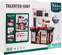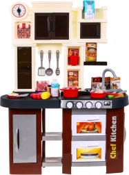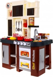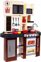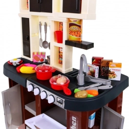 Ez a minőségi, barna-fekete játékkonyha valósághű főzési élményt kínál. A gombok elfordítására felgyulladnak az égők, és autentikus főzési és sütési hangok hallhatók. A folyó vizes csapnak köszönhetően a kis szakácsok kipróbálhatják az edények valódi elmosását és az ételek előkészítését.