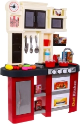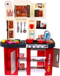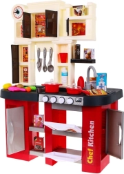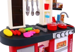 Ez a tágas, műanyag játékkonyha piros-fekete dizájnnal 3 éves kortól nyújt hiteles főzési élményt. A gombok elfordítása után életre kelő fényhatások és a főzés, sütés hangjai támogatják a kreatív játékot és a finommotorika fejlődését. A szórakozást a működő vízcsap is új szintre emeli.