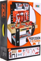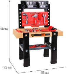 Az élethű részletek, mint a satu, csavarok, anyák és a „fa” lyukas lécek végtelen csavarozásra, méricskélésre és saját projektek kitalálására hívnak. A gyerekek játékos formában tanulják meg az alapvető munkafolyamatokat, a válogatást és a szerszámok felismerését.