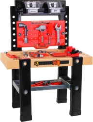 Építsd meg a gyerekek első műhelyét! A stabil munkapad akasztókkal, polccal és tároló kosarakkal áttekinthető helyet ad a játékhoz és a tanuláshoz. A készlet változatos műanyag szerszámokat és kötőelemeket tartalmaz, amelyek biztonságosak a kis kezek számára, és kiválóak a fogás, a kéz–szem koordináció és a türelem gyakorlásához.