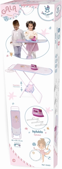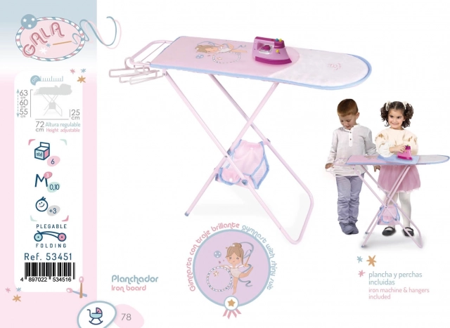 A GALA kollekció játékos, összecsukható babavasalódeszkája örömet szerez minden kis háziasszonynak. Háromszintű, állítható magasságot, könnyű kezelhetőséget és gazdag kiegészítőket a valósághű játékhoz kínál – műanyag vasalót, vállfákat és egy praktikus textil kosarat. Remek dizájnja és precíz kivitelezése támogatja a kreatív játékot 3 éves kortól.