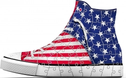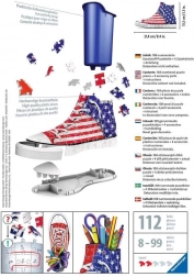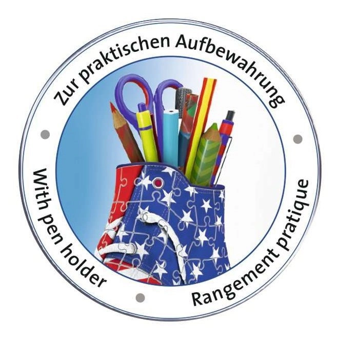 Zseniális párosítás a tornacipők és a kirakók szerelmeseinek! Rakd ki a 3D puzzle-t egy szokatlan formában, amely életre kelti az asztalodat... A RAVENSBURGER 3D tornacipők gyártásába kezdett, amelyeket például egyedi ceruzatartóként is használhatsz tollakhoz, ceruzákhoz vagy akár ecsetekhez. A speciálisan ívelt vagy hajlítható elemek pontosan a helyükre illeszkednek, így egy amerikai zászló mintájával díszített, rendkívül élethű tornacipő építhető. Az elemek kemény műanyagból készülnek, ami kiváló stabilitást garantál. A cipő ragasztás nélkül is tart. A csomag tartalma: 108 számozott puzzle elem, 4 kiegészítő elem és útmutató. A fényképen látható tartalom nem része a csomagnak. Az összeállított puzzle mérete kb. 21,4 × 13,5 cm
