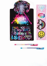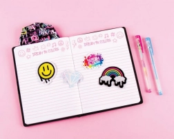 A graffiti stílusú kapucnis notesz tökéletes a 6 éves kortól lányok számára, akik ki szeretnék fejezni kreativitásukat. Ez a modern notesz ideális hely az élmények, titkos álmok vagy kalandtervek feljegyzésére. Két tollal, matricákkal és ragasztós foltokkal kerül forgalomba, amelyek lehetővé teszik minden egyes notesz személyre szabását.