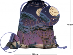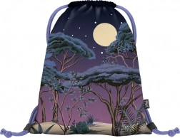 A hátizsákot erdő, hold és csillagok éjszakai designja díszíti, ideális szabadtéri vagy szabadidős használatra.