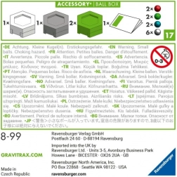 Ebben a GraviTrax készletben 12 színes golyót talál: 6 ezüst, 2 piros, 2 kék és 2 zöld. A golyókat szín szerint rendezhetjük, vagy fantáziánk szerint keverhetjük. A készlet tartalmaz továbbá 4 dobozt a golyók rendezéséhez - 2 zöld, 1 fehér és 1 szürke. Ezek a dobozok egymásra helyezhetők, ami lehetővé teszi a tárolást kisebb helyeken is.