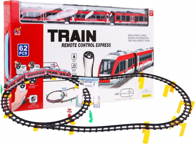 Nagy vasúti készlet sínekkel 3 éves kortól. A készlet 62 elemből áll, a pálya hossza akár 396 cm. A vonat távirányítóval vezérelhető, az óramutató járásával megegyező vagy ellentétes irányban halad. A vonat menetzajokat ad ki, és az előre vagy hátsó lámpák világítanak a haladási iránytól függően. A játék AA elemekkel működik – 2 x 1,5 V (távirányító) és 3 x 1,5 V (vonat).