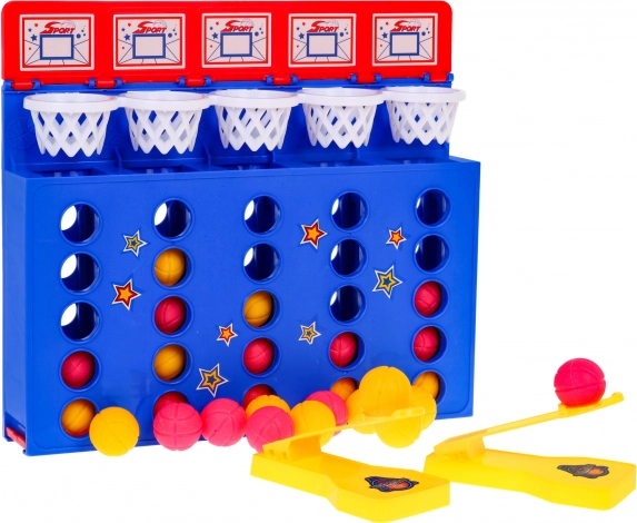 A Kosárlabda – 4 egy sorban játék ötvözi a népszerű „4 egy sorban” elvet a labdák kosárba lövésének dinamikájával. A praktikus kilövővel juttasd a labdákat a felső kosarakba úgy, hogy egy összefüggő, egyszínű sort alkossanak. Aki elsőként rak ki négyet egymás mellé, nyer!