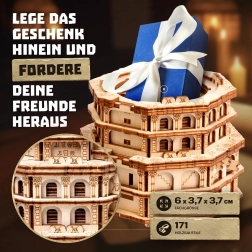 Tartozéka egy titkos rekesz (6 × 3,7 × 3,7 cm), amelybe elrejthet útmutatót, üzenetet vagy kis ajándékot – tökéletes egyedi meglepetéshez. A csomagban képes útmutató és QR-kódos súgó található, hogy ne akadjon el sokáig. Tartós kivitelének köszönhetően a rejtvény a végigjátszás után megosztható barátokkal és családdal.