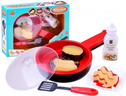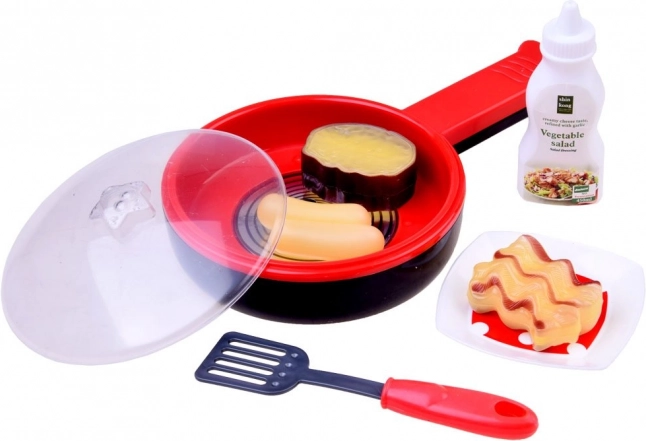 A készlet tartalmaz egy serpenyőt, fedőt, többféle élelmiszert és kiegészítőket, amelyeket a gyerekek a főzés játékához használhatnak.