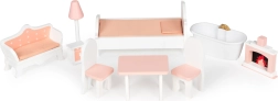 A készlet tartalma 9 színes fa bútordarab: lámpa, ágy, szekrény, kandalló, asztal, két szék, kanapé, kád.