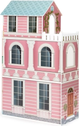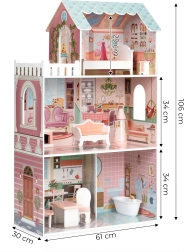 Ez a babaház illeszkedik nemcsak a gyerekszobába, hanem a nappaliba is, ahol nemcsak a házigazdákat, hanem a vendégeket is lenyűgözi kifinomult és jól megválasztott színvilágával. Ezenkívül a szép fa részletek és a pasztellszínek támogatják a kreativitás és a kézügyesség fejlesztését.