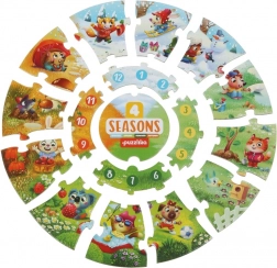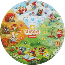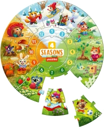 A Puzzlika márkájú Négy évszak puzzle modern, kreatív dizájnnal kápráztat, és már 2 éves kortól ajánlott gyerekeknek. A kirakott puzzle egy nagy, kerek képet alkot, amely 28 cm átmérőjű, és a különböző évszakokat jellemző kültéri tevékenységeket ábrázolja. Ez az oktatási játék segít a gyerekeknek fejleszteni a logikai gondolkodást, a képzelőerőt és a finom motorikát.