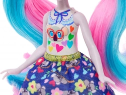 A babának hosszú, kék haja van rózsaszín csíkokkal és színes ruházata, amely minden gyermeket lenyűgöz.