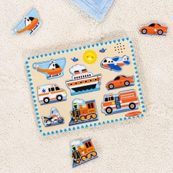• Tartalmaz 9 kivehető puzzle darabot különböző járművekkel: repülő, hajó, helikopter, mentőautó, autó, motorkerékpár, mozdony és tűzoltóautó.