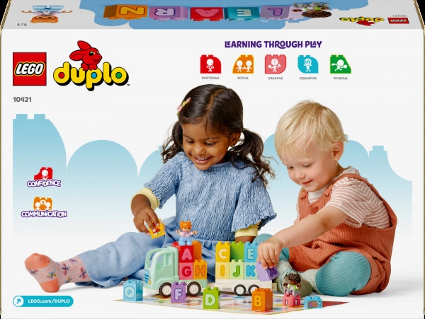 Fedezd fel a szórakoztató tanulást közlekedési témával! A Lego Duplo betűkamion ideális 2 éves kortól: a gyerekek csatlakoztatják az utánfutót, felrakodják a A–Z betűs kockákat, színeket válogatnak és megalkotják első szavaikat. A sztereó elem és a könyvecske játékos módon segíti az ábécé gyakorlását, továbbá 2 figura és biztonságos, könnyen megfogható elemek várják a kis kezeket.