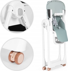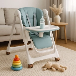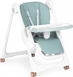 A megemelt peremű, pohártartós dupla tálca csökkenti a rendetlenséget, a felső réteg pedig étkezés után egyszerűen leemelhető és elmosható. Az ökobőr huzat nedves ruhával könnyen tisztítható. A gumifutófelületű kerekek megkönnyítik az áthelyezést a padló megkarcolása nélkül, a beépített kerékrögzítők pedig stabilan rögzítik a széket.