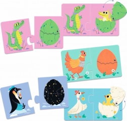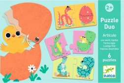 A vidám „Funny eggs” duo puzzle az állatokat párosítja a tojásaikkal vagy kölykeikkel egyszerű párokba rendezve. A gyerekek játékos formában gyakorolják a formák és képek felismerését, a vizuális memóriát és a kéz–szem koordinációt. A nagy, masszív elemeknek köszönhetően a legkisebbek is jól meg tudják fogni.