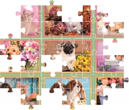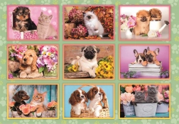 Kollázs rengeteg kiskutyával (és kiscicával) virágok között, amely elbűvöli az állatkedvelőket, és összerakás után díszíti bármely gyerekszobát.