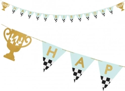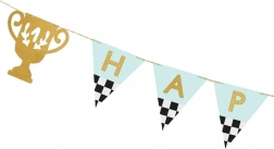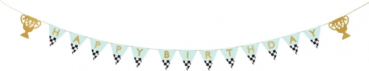 A banner világoskék és fekete-fehér kockás mintákkal rendelkezik, amelyek a trófeákkal együtt sportos megjelenést kölcsönöznek. Nemcsak gyerekeknek, hanem felnőttek ünnepségeihez is alkalmas.