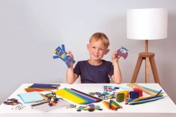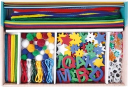 Színes papírok, habgumi elemek, zseníliadrótok, mozgó szemek, pomponok, fagylaltpálcikák, gombok és egyéb apróságok