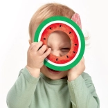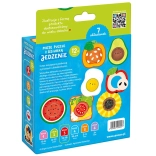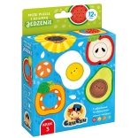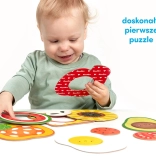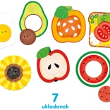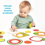 Első kirakó a legkisebbeknek, amely játékra csábít! A szett 7 nagy, két darabból álló étel-témájú kirakót tartalmaz cserélhető korongokkal. Az egyszerű behelyezési rendszernek köszönhetően az építés intuitív és motiváló. Támogatja a finommotorikát, a folyamatos koncentrációt, a formák és színek érzékelését, valamint a természetes felfedezés örömét.