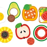 A kirakóval való játék természetes módon fejleszti a finommotorikát, a észrevételt és a türelmet. Együtt megnevezhetitek az ételeket, színeket és formákat, kereshettek hasonlóságokat és különbségeket, valamint kitalálhattok olyan kérdéseket, mint „Melyiknek van magja?” vagy „Hol van a tojás?”. A nagyobb gyerekek a darabokat felhasználhatják boltos vagy főzős játékhoz, illetve inspirációként saját rajzokhoz.