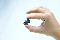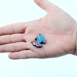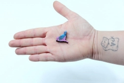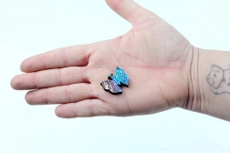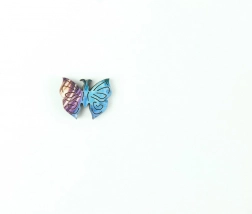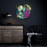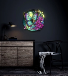 A kék és lila árnyalatú pillangó motívum az UV digitális nyomtatásnak és a szokatlan kör formátumnak köszönhetően első pillantásra magára vonja a figyelmet.