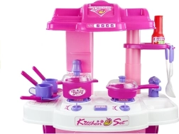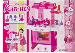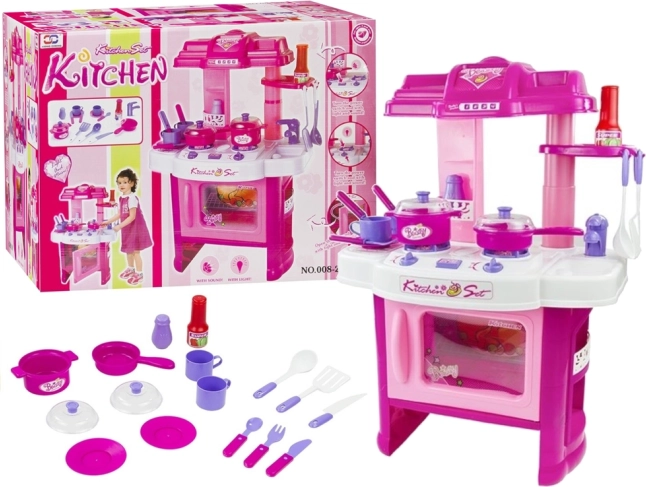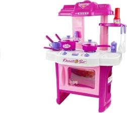 A bemutatott konyha tiszteletet érdemlő, 22 elemből álló készlet, amely a konyhai felszerelés fontos része. A játéktűzhelyen két, egymástól független kapcsolóval működő világító égő található. Bekapcsolás után a gyermek a főzésre emlékeztető hangot hall. A kis konyhai segítő készlet további előnye a beépített sütőkapcsoló, azaz a időzítő. Amikor a gyermek bekapcsolja, jellegzetes sütőhang hallatszik, és belül felkapcsol a fény. A beállított idő letelte után a konyha automatikusan kikapcsol.