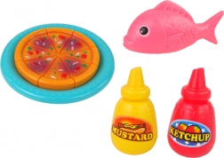 A csomagban műanyag játékok, mint például hal, csirke és pizza találhatók, amelyek bővítik a játék lehetőségeit.