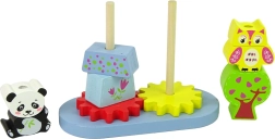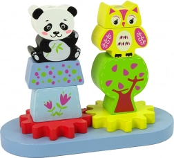 Ez a fantasztikus fa készlet egy bázisból áll különböző formájú és méretű kockákkal, melyek állatokat ábrázolnak, mint a panda és a bagoly. Emellett két fogaskereket is tartalmaz, amelyek mozgást adnak a játéknak. Ezek a kockák ideálisak a kisgyermekek kézügyességének és precíziós képességeinek fejlesztésére, amikor a kiemelkedő karokra helyezik azokat.