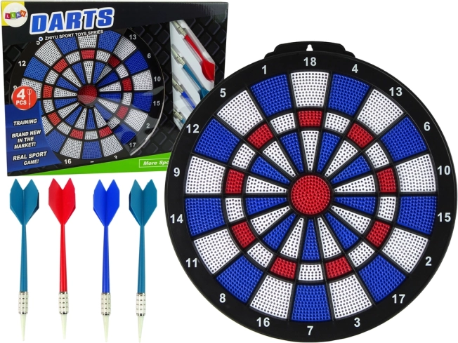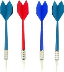 Négy fémes dart különböző színű tollakkal a pontos célzás érdekében.