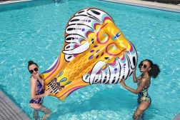 Vidám, művészi grafika élénk színekben, amely kitűnik a medencénél, és nyári hangulatot kölcsönöz minden fürdőzésnek.