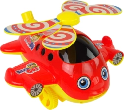 A helikopternek forgó rotorjai vannak, amelyek csengetős hangokat adnak, és mozgáskor játékos elemek csúsznak ki az elejéről. A csatolt bot könnyű tolást tesz lehetővé.