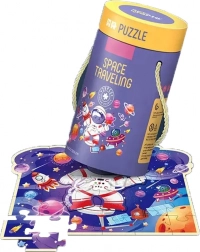 Az illusztrációk tartalmazzák egy kis űrhajós figuráját a bolygókkal, rakétákkal és műholdakkal teli környezetben, amelyek bevonják a gyermeket egy színes és részletes űrbeli kalandba. A kényelmes kör alakú csomagolás lehetővé teszi az egyszerű szállítást és tárolást, ideális otthoni használatra és utazás közben is.