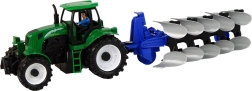 A zöld traktor kék ekével és levehető fülkével támogatja a képzelőerőt és a valódi mezőgazdasági munkák utánzását.