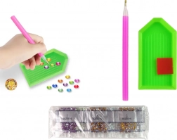 A készlet különböző színű kristályokat tartalmaz, amelyek felhasználhatók dekorációhoz. A gyémántok felragasztására szolgáló felület ragasztóval van bevonva, és számok jelzik, milyen színt használjunk. Rakd össze őket egyenként, és alkoss egy kis műalkotást!