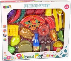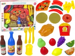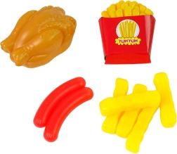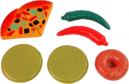 A szett pizzadarabokat, paprikát, hamburgereket és derelyét tartalmaz. Színes és szórakoztató játékok, amelyek ösztönzik a szerepjátékot és az ételkészítés szimulációját.
