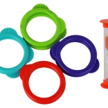 A szett négy színű karikákat és egy homokórát tartalmaz gyors versenykörökhöz. Állítsátok be az időt, és próbáljatok minél több karikát feldobni, mielőtt lepereg a homok.