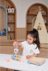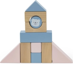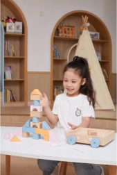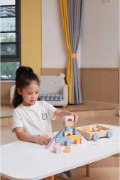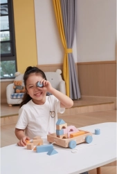 A kockák bükkfából készültek, harmonikus színekre festve és gyerekek számára biztonságosak. Játék után a kockák visszatehetők a kocsira, ami lehetővé teszi az egyszerű rendszerezést. A madzag segítségével a gyerek kocsit húzhat a padlón, ami nemcsak szórakoztató, hanem praktikus is.