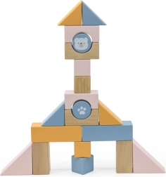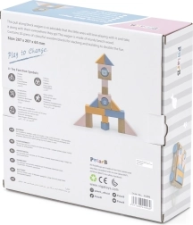 20 kocka különböző pasztell színekben és formákban támogatja a kreatív építést és a kézügyesség fejlesztését.