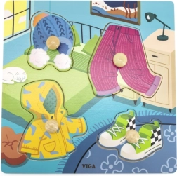 Fa puzzle ruhadarabokkal a neves Viga márkától, amely nemcsak hagyományos kirakós játékot kínál, hanem lehetővé teszi a gyerekek számára a finommotorika és az alakfelismerő képességek fejlesztését is. A puzzle emellett segít javítani a logikus gondolkodást, koncentrációt és a memóriát a gyerekeknél.