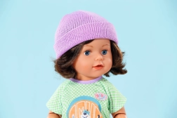 A baba kockás pólót, farmerhatású nadrágot és sportcipőt visel. A lila sapka a kiengedett vállig érő hajjal még stílusosabbá teszi a megjelenést.
