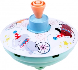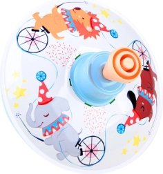 A játékfelületet játékos, cirkuszi témájú állatfigurák díszítik, amelyek fejlesztik a fantáziát és a vizuális észlelést. A fém test és a műanyag fogantyú kombinációja tartósságot biztosít a mindennapos használathoz. A pörgettyű kiváló a finommotorika, a szem–kéz koordináció és a türelem fejlesztésére.