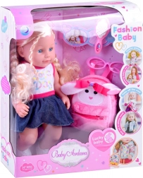 A baba könnyedén ül, és támasztva meg is áll. A rózsaszín szemüveg és a nyuszifüles plüss hátizsák ösztönzi a képzeletet és a bájos stílust.