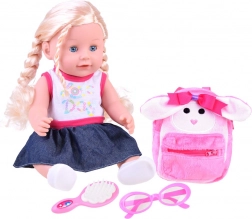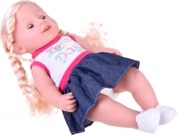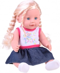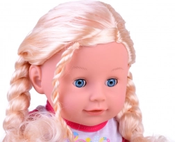 Ez a bájos, körülbelül 40 cm magas baba biztonságos, minőségi anyagból készül, és élethű arcrészleteivel, valamint finom mosolyával hódít. A hosszú, szőke, copfokba font haj fésülésre és formázásra csábít, a csukódó mechanikájú kék szemek pedig még valóságosabbá teszik a játékot.