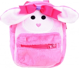A fülecskékkel és masnival díszített hátizsák puha tapintású, cipzáras zsebbel rendelkezik, és elférnek benne az apró úti kiegészítők.